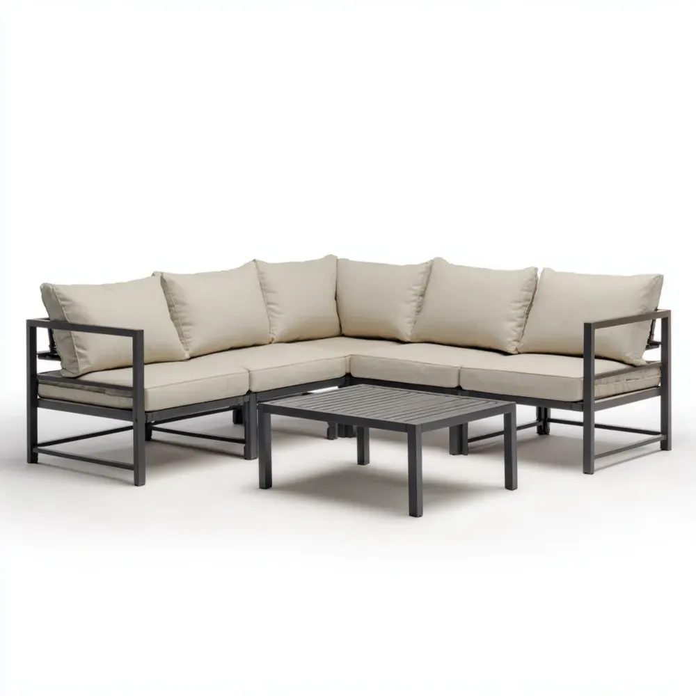 Das Ecksofa-Set besteht aus einem Aluminiumrahmen und Kissen mit Polyesterbezug. Die Rahmen sind wetterbeständig, und die Kissen sind in Cremefarbe gehalten. Die Sofagröße beträgt 200x200x90 cm, und der Tisch misst 80x80x45 cm.