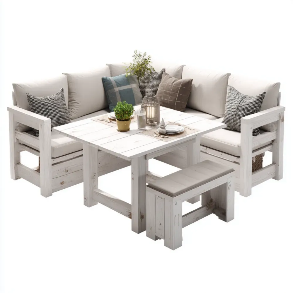 Das Gartenset umfasst ein Ecksofa aus weiß gestrichenem Kiefernholz mit Schaumstoffpolstern, eine Sitzbank aus dem gleichen Material und einen Tisch. Die Bezüge der Polster sind aus Polyester hergestellt.