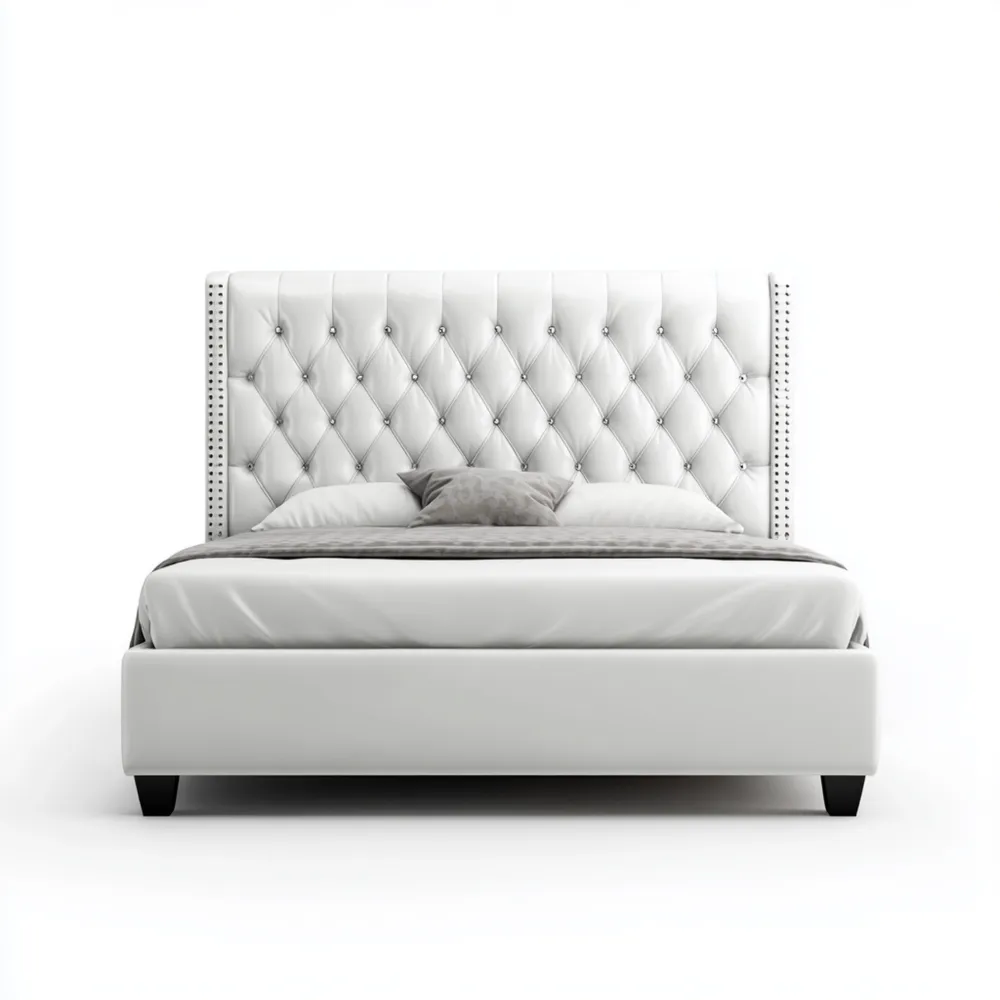 Das Bett ist mit weißem, strapazierfähigem Kunstleder bezogen. Die Kopfteilfüllung besteht aus Schaumstoff und das Kopfteil ist 100 cm hoch.