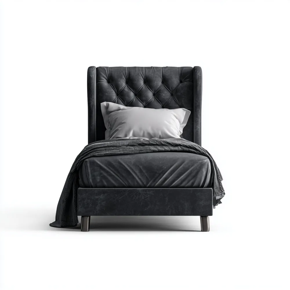 Das Einzelbett hat einen Bezug aus dunkelgrauem Samt und ein schlichtes Design.